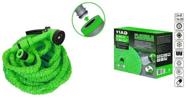 Manguera de jardín telescópica y extensible de 7,5 metros de longitud, diseñada para ofrecer máxima comodidad en espacios reducidos. Fabricada en PVC flexible y resistente al desgaste, se expande bajo presión y se contrae al vaciarse, evitando nudos y enredos. Incluye conectores rápidos para una instalación sencilla y una boquilla pulverizadora con múltiples patrones de riego. Ligera, compacta y fácil de almacenar. Ideal para terrazas, balcones y pequeños jardines.